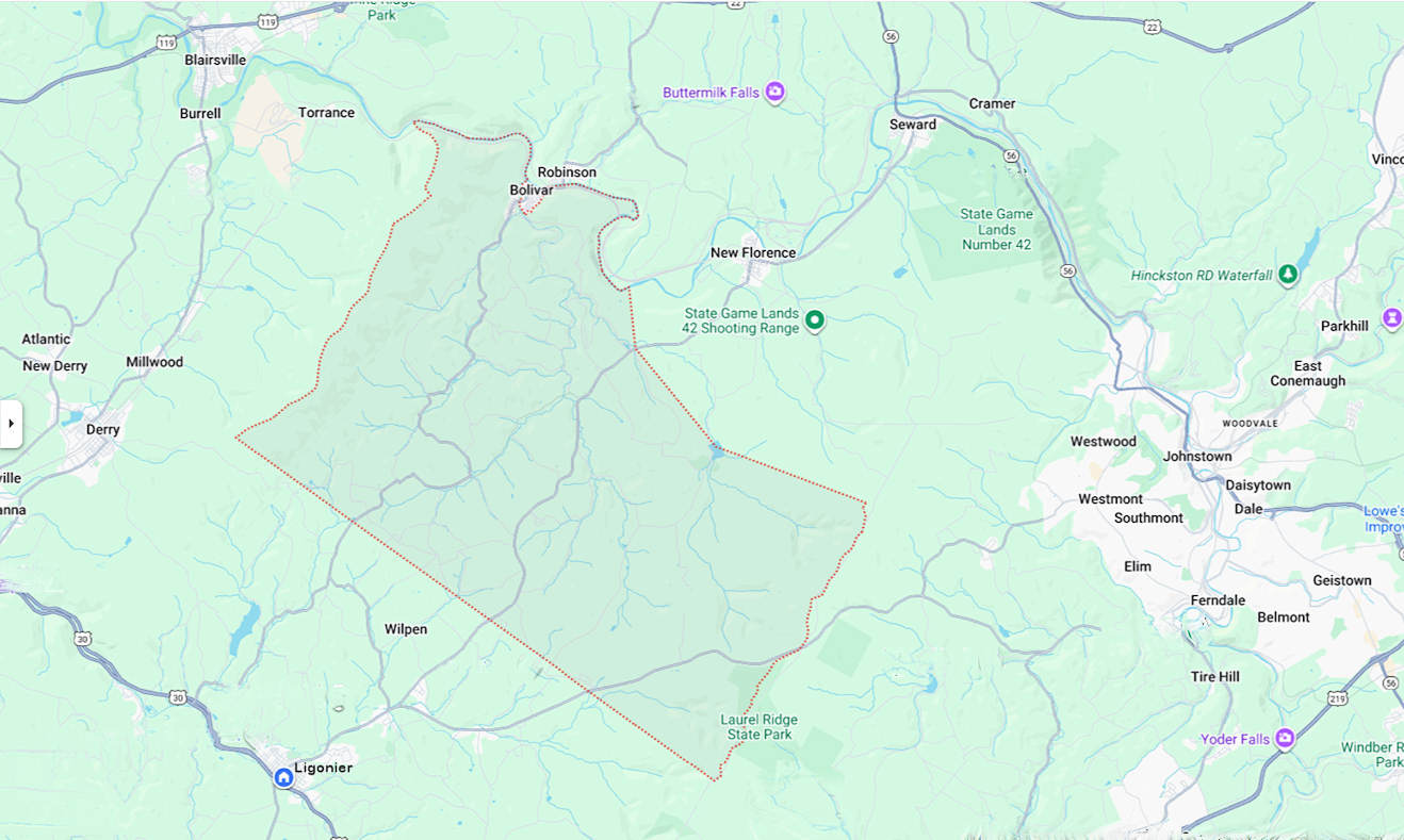 While Fairfield is mostly a rural township, it is close to the communities of Derry, New Florence, Latrobe, Blairsville, Ligonier and Johnstown. Click image to enlarge and expand.